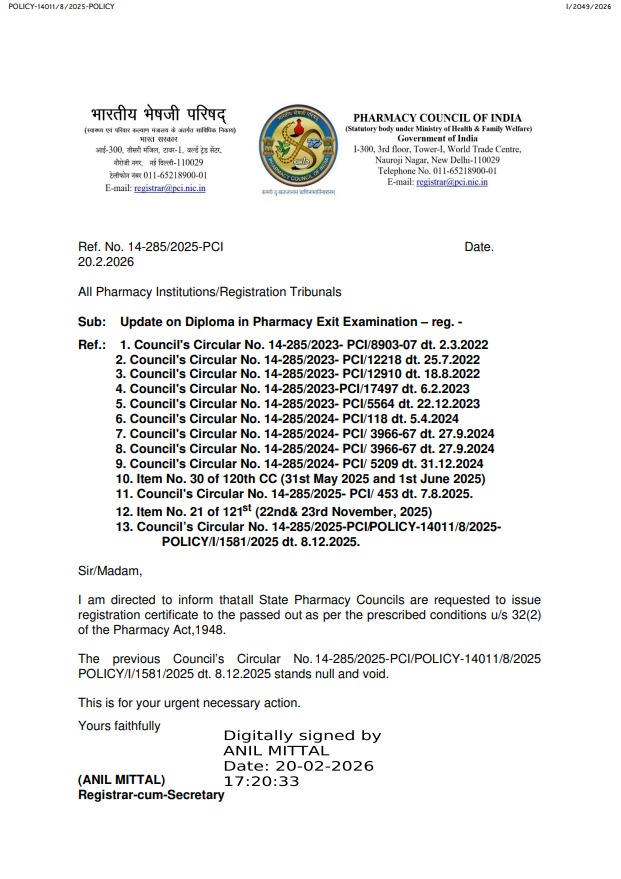 | The Pharmacy Council of India (PCI) has released a fresh circular (Ref. No. 14-285/2025-PCI) dated 20.02.2026 regarding the Diploma in Pharmacy Exit Examination. The council has directed all State Pharmacy Councils to initiate the registration process for passed-out candidates under Section 32(2) of the Pharmacy Act, 1948. This is a vital update for D.Pharm students awaiting their registered pharmacist status. |