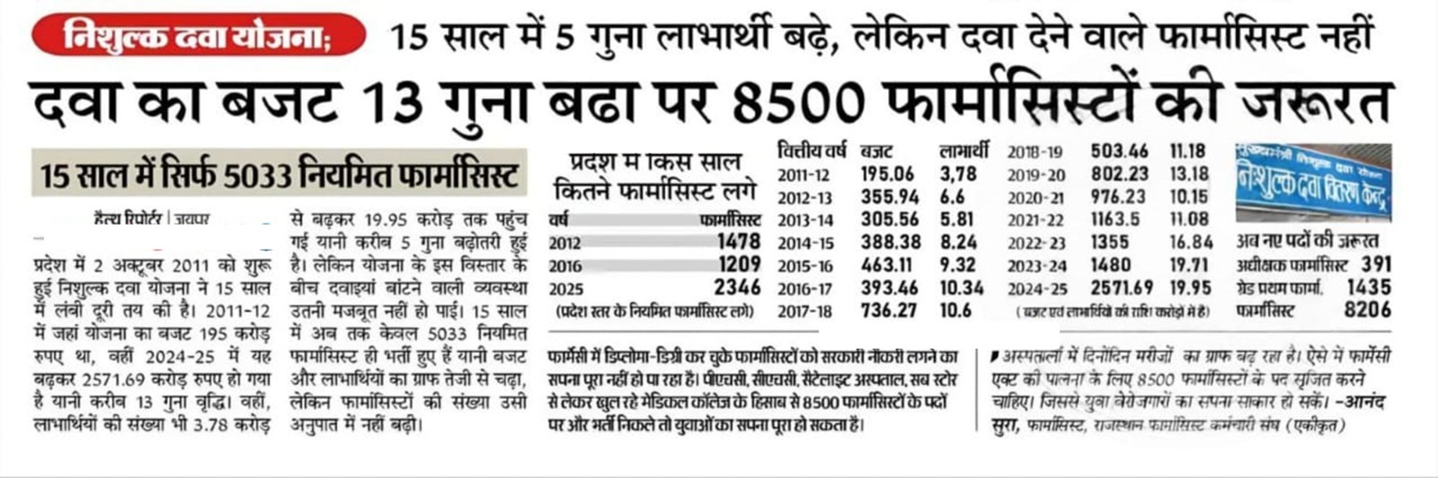 According to recent health department reports from Rajasthan, there is a massive requirement for 8,500+ Pharmacists to effectively manage the Free Medicine Scheme (Nishulk Dawa Yojana). While the medicine budget has increased 13 times and beneficiaries have grown 5 times over the last 15 years, the number of regular pharmacists has not kept pace. The Rajasthan Pharmacist Employee Association (Integrated) has urged the government to create new positions for Superintendent Pharmacists, Grade-I, and regular Pharmacists to ensure patient safety and legal compliance with the Pharmacy Act.